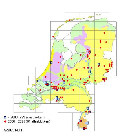 Het aantal atlasblokken (5x5 km) waarin de soort is gemeld binnen een periode van vijf jaar (vanaf 1980) of twintig jaar. Niet gecorrigeerd voor waarnemersinspanning en het aantal doorgegeven waarnemingen kan sterk variëren per periode, dus een trend in verspreiding kan hier niet direct uit worden afgelezen. Het opgegeven jaartal is het eerste jaar van de periode. Bron: gevalideerde waarnemingen uit de NDFF.