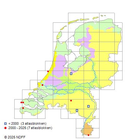 Het aantal atlasblokken (5x5 km) waarin de soort is gemeld binnen een periode van vijf jaar (vanaf 1980) of twintig jaar. Niet gecorrigeerd voor waarnemersinspanning en het aantal doorgegeven waarnemingen kan sterk variëren per periode, dus een trend in verspreiding kan hier niet direct uit worden afgelezen. Het opgegeven jaartal is het eerste jaar van de periode. Bron: gevalideerde waarnemingen uit de NDFF.