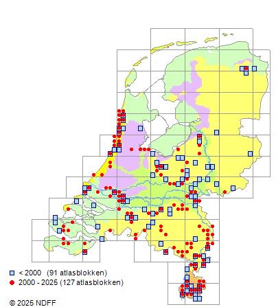 Het aantal atlasblokken (5x5 km) waarin de soort is gemeld binnen een periode van vijf jaar (vanaf 1980) of twintig jaar. Niet gecorrigeerd voor waarnemersinspanning en het aantal doorgegeven waarnemingen kan sterk variëren per periode, dus een trend in verspreiding kan hier niet direct uit worden afgelezen. Het opgegeven jaartal is het eerste jaar van de periode. Bron: gevalideerde waarnemingen uit de NDFF.