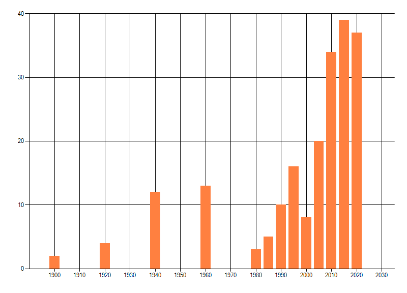Het aantal atlasblokken (5x5 km) waarin de soort is gemeld binnen een periode van vijf jaar (vanaf 1980) of twintig jaar. Niet gecorrigeerd voor waarnemersinspanning en het aantal doorgegeven waarnemingen kan sterk variëren per periode, dus een trend in verspreiding kan hier niet direct uit worden afgelezen. Het opgegeven jaartal is het eerste jaar van de periode. Bron: gevalideerde waarnemingen uit de NDFF.