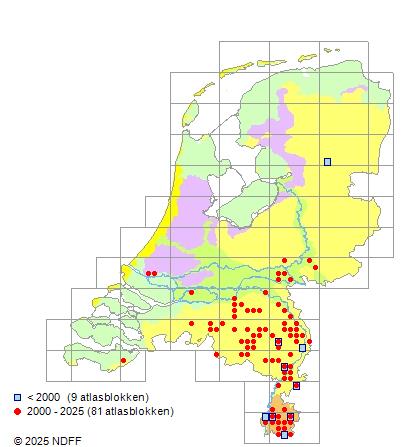 Het aantal atlasblokken (5x5 km) waarin de soort is gemeld binnen een periode van vijf jaar (vanaf 1980) of twintig jaar. Niet gecorrigeerd voor waarnemersinspanning en het aantal doorgegeven waarnemingen kan sterk variëren per periode, dus een trend in verspreiding kan hier niet direct uit worden afgelezen. Het opgegeven jaartal is het eerste jaar van de periode. Bron: gevalideerde waarnemingen uit de NDFF.