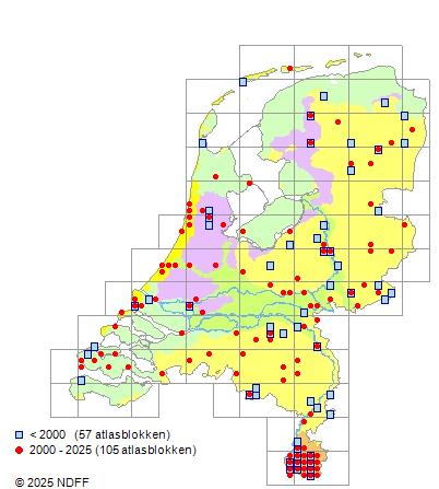 Het aantal atlasblokken (5x5 km) waarin de soort is gemeld binnen een periode van vijf jaar (vanaf 1980) of twintig jaar. Niet gecorrigeerd voor waarnemersinspanning en het aantal doorgegeven waarnemingen kan sterk variëren per periode, dus een trend in verspreiding kan hier niet direct uit worden afgelezen. Het opgegeven jaartal is het eerste jaar van de periode. Bron: gevalideerde waarnemingen uit de NDFF.