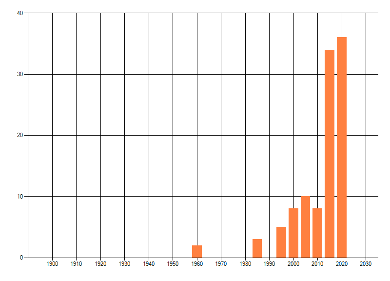 Het aantal atlasblokken (5x5 km) waarin de soort is gemeld binnen een periode van vijf jaar (vanaf 1980) of twintig jaar. Niet gecorrigeerd voor waarnemersinspanning en het aantal doorgegeven waarnemingen kan sterk variëren per periode, dus een trend in verspreiding kan hier niet direct uit worden afgelezen. Het opgegeven jaartal is het eerste jaar van de periode. Bron: gevalideerde waarnemingen uit de NDFF.