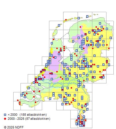 Het aantal atlasblokken (5x5 km) waarin de soort is gemeld binnen een periode van vijf jaar (vanaf 1980) of twintig jaar. Niet gecorrigeerd voor waarnemersinspanning en het aantal doorgegeven waarnemingen kan sterk variëren per periode, dus een trend in verspreiding kan hier niet direct uit worden afgelezen. Het opgegeven jaartal is het eerste jaar van de periode. Bron: gevalideerde waarnemingen uit de NDFF.