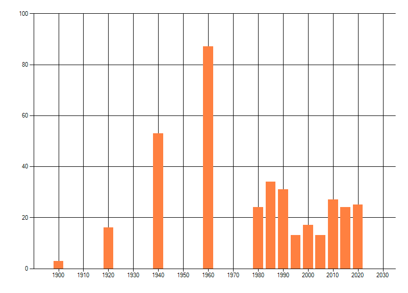 Het aantal atlasblokken (5x5 km) waarin de soort is gemeld binnen een periode van vijf jaar (vanaf 1980) of twintig jaar. Niet gecorrigeerd voor waarnemersinspanning en het aantal doorgegeven waarnemingen kan sterk variëren per periode, dus een trend in verspreiding kan hier niet direct uit worden afgelezen. Het opgegeven jaartal is het eerste jaar van de periode. Bron: gevalideerde waarnemingen uit de NDFF.