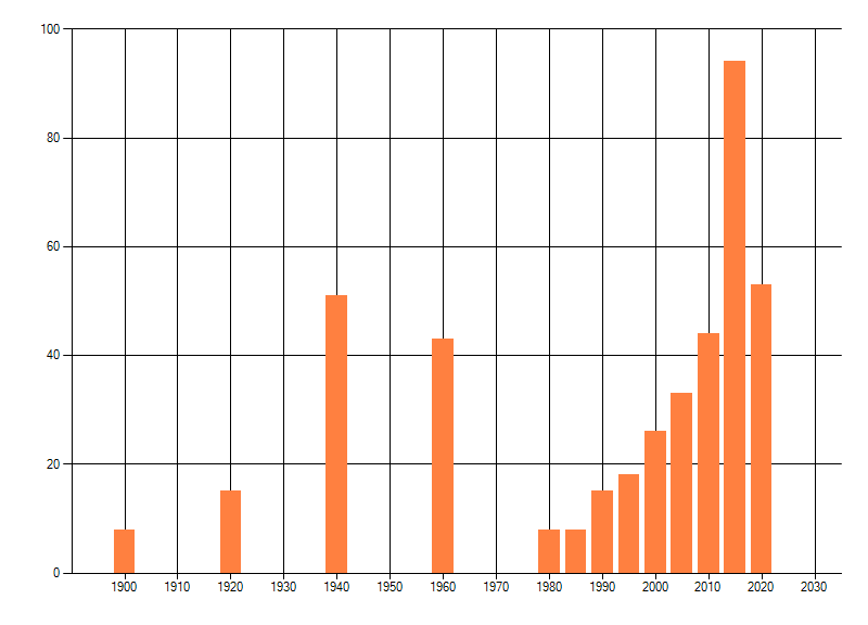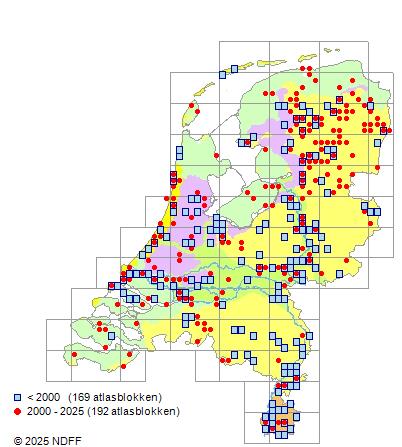 Het aantal atlasblokken (5x5 km) waarin de soort is gemeld binnen een periode van vijf jaar (vanaf 1980) of twintig jaar. Niet gecorrigeerd voor waarnemersinspanning en het aantal doorgegeven waarnemingen kan sterk variëren per periode, dus een trend in verspreiding kan hier niet direct uit worden afgelezen. Het opgegeven jaartal is het eerste jaar van de periode. Bron: gevalideerde waarnemingen uit de NDFF.
