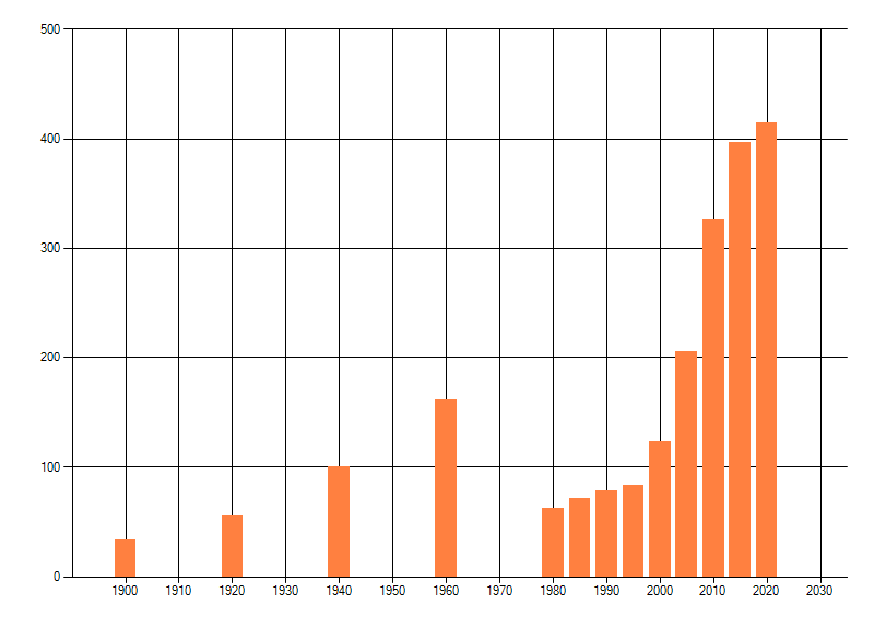 Het aantal atlasblokken (5x5 km) waarin de soort is gemeld binnen een periode van vijf jaar (vanaf 1980) of twintig jaar. Niet gecorrigeerd voor waarnemersinspanning en het aantal doorgegeven waarnemingen kan sterk variëren per periode, dus een trend in verspreiding kan hier niet direct uit worden afgelezen. Het opgegeven jaartal is het eerste jaar van de periode. Bron: gevalideerde waarnemingen uit de NDFF.