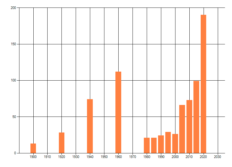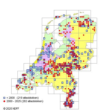 Het aantal atlasblokken (5x5 km) waarin de soort is gemeld binnen een periode van vijf jaar (vanaf 1980) of twintig jaar. Niet gecorrigeerd voor waarnemersinspanning en het aantal doorgegeven waarnemingen kan sterk variëren per periode, dus een trend in verspreiding kan hier niet direct uit worden afgelezen. Het opgegeven jaartal is het eerste jaar van de periode. Bron: gevalideerde waarnemingen uit de NDFF.
