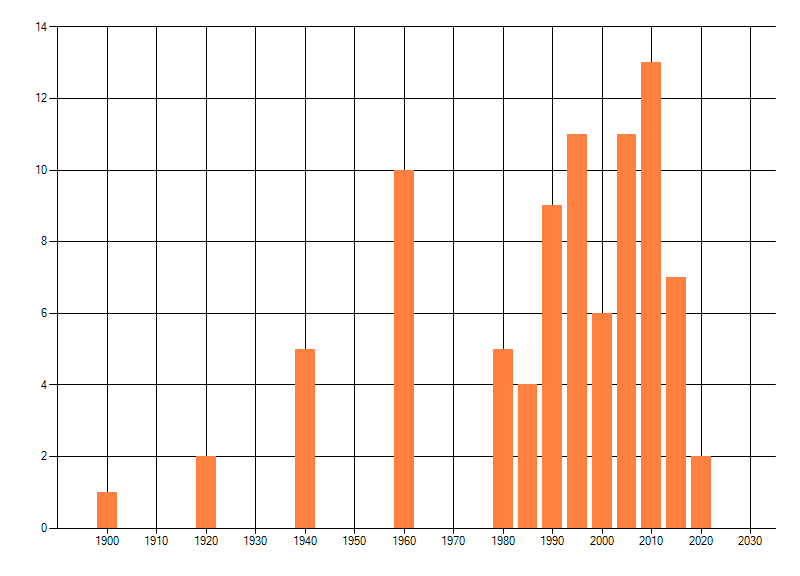 Het aantal atlasblokken (5x5 km) waarin de soort is gemeld binnen een periode van vijf jaar (vanaf 1980) of twintig jaar. Niet gecorrigeerd voor waarnemersinspanning en het aantal doorgegeven waarnemingen kan sterk variëren per periode, dus een trend in verspreiding kan hier niet direct uit worden afgelezen. Het opgegeven jaartal is het eerste jaar van de periode. Bron: gevalideerde waarnemingen uit de NDFF.