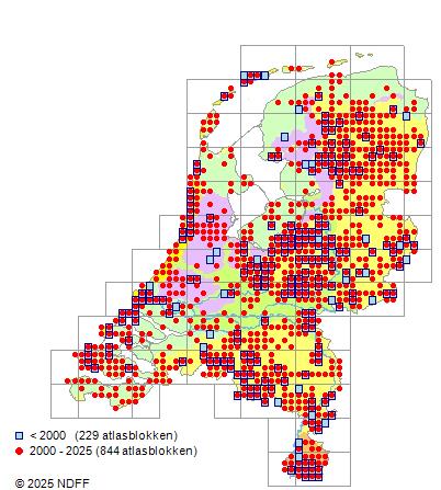 Het aantal atlasblokken (5x5 km) waarin de soort is gemeld binnen een periode van vijf jaar (vanaf 1980) of twintig jaar. Niet gecorrigeerd voor waarnemersinspanning en het aantal doorgegeven waarnemingen kan sterk variëren per periode, dus een trend in verspreiding kan hier niet direct uit worden afgelezen. Het opgegeven jaartal is het eerste jaar van de periode. Bron: gevalideerde waarnemingen uit de NDFF.