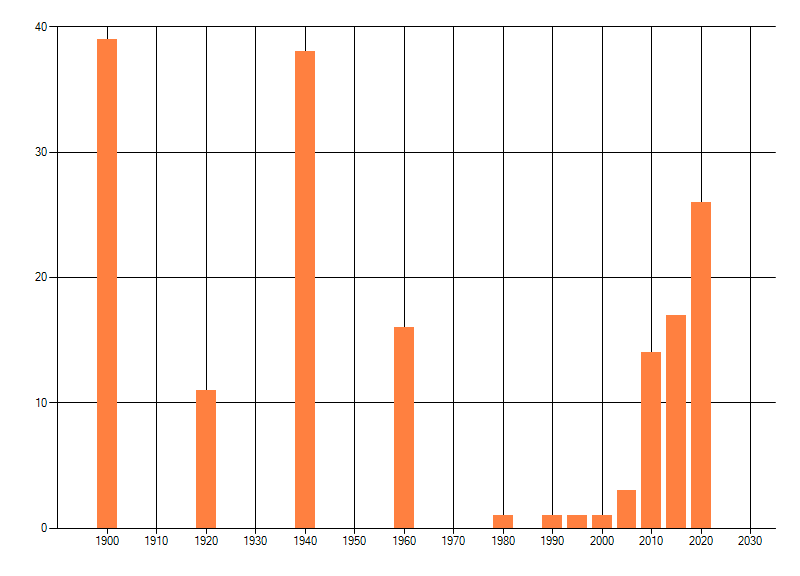 Het aantal atlasblokken (5x5 km) waarin de soort is gemeld binnen een periode van vijf jaar (vanaf 1980) of twintig jaar. Niet gecorrigeerd voor waarnemersinspanning en het aantal doorgegeven waarnemingen kan sterk variëren per periode, dus een trend in verspreiding kan hier niet direct uit worden afgelezen. Het opgegeven jaartal is het eerste jaar van de periode. Bron: gevalideerde waarnemingen uit de NDFF.