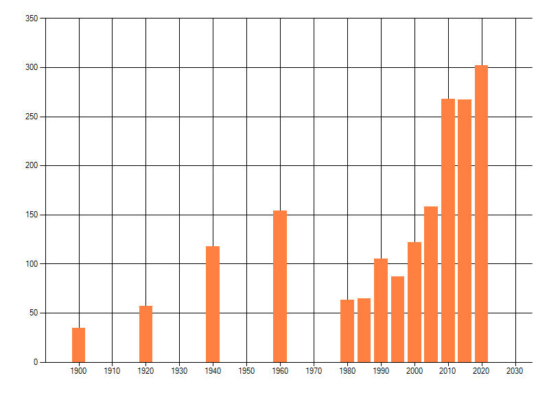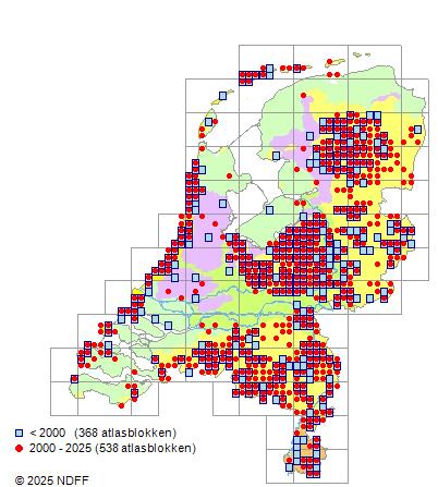 Het aantal atlasblokken (5x5 km) waarin de soort is gemeld binnen een periode van vijf jaar (vanaf 1980) of twintig jaar. Niet gecorrigeerd voor waarnemersinspanning en het aantal doorgegeven waarnemingen kan sterk variëren per periode, dus een trend in verspreiding kan hier niet direct uit worden afgelezen. Het opgegeven jaartal is het eerste jaar van de periode. Bron: gevalideerde waarnemingen uit de NDFF.