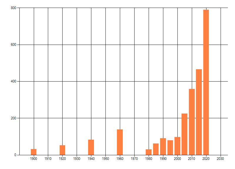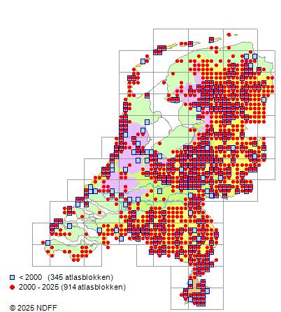 Het aantal atlasblokken (5x5 km) waarin de soort is gemeld binnen een periode van vijf jaar (vanaf 1980) of twintig jaar. Niet gecorrigeerd voor waarnemersinspanning en het aantal doorgegeven waarnemingen kan sterk variëren per periode, dus een trend in verspreiding kan hier niet direct uit worden afgelezen. Het opgegeven jaartal is het eerste jaar van de periode. Bron: gevalideerde waarnemingen uit de NDFF.