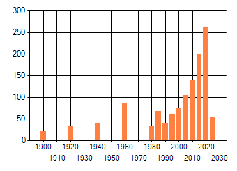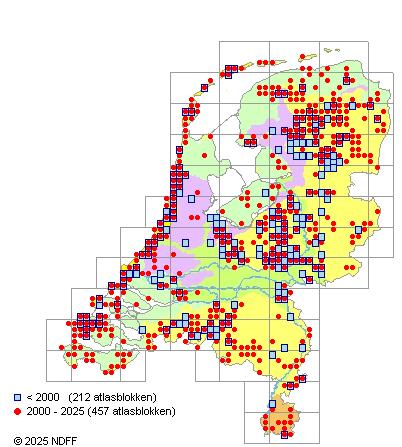 Het aantal atlasblokken (5x5 km) waarin de soort is gemeld binnen een periode van vijf jaar (vanaf 1980) of twintig jaar. Niet gecorrigeerd voor waarnemersinspanning en het aantal doorgegeven waarnemingen kan sterk variëren per periode, dus een trend in verspreiding kan hier niet direct uit worden afgelezen. Het opgegeven jaartal is het eerste jaar van de periode. Bron: gevalideerde waarnemingen uit de NDFF.