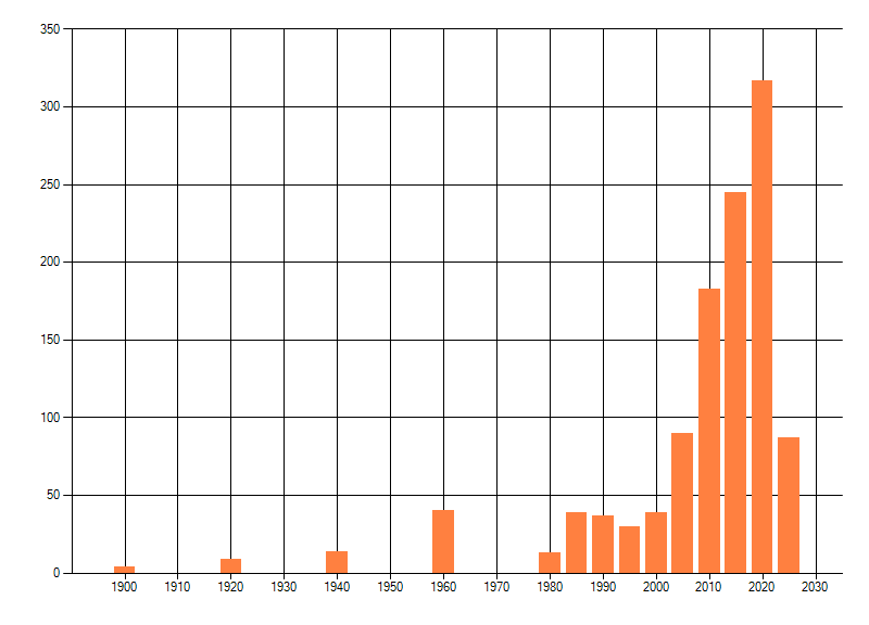 Het aantal atlasblokken (5x5 km) waarin de soort is gemeld binnen een periode van vijf jaar (vanaf 1980) of twintig jaar. Niet gecorrigeerd voor waarnemersinspanning en het aantal doorgegeven waarnemingen kan sterk variëren per periode, dus een trend in verspreiding kan hier niet direct uit worden afgelezen. Het opgegeven jaartal is het eerste jaar van de periode. Bron: gevalideerde waarnemingen uit de NDFF.