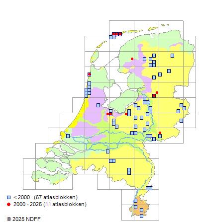 Het aantal atlasblokken (5x5 km) waarin de soort is gemeld binnen een periode van vijf jaar (vanaf 1980) of twintig jaar. Niet gecorrigeerd voor waarnemersinspanning en het aantal doorgegeven waarnemingen kan sterk variëren per periode, dus een trend in verspreiding kan hier niet direct uit worden afgelezen. Het opgegeven jaartal is het eerste jaar van de periode. Bron: gevalideerde waarnemingen uit de NDFF.
