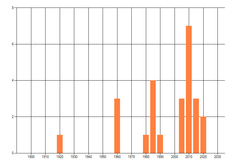 Het aantal atlasblokken (5x5 km) waarin de soort is gemeld binnen een periode van vijf jaar (vanaf 1980) of twintig jaar. Niet gecorrigeerd voor waarnemersinspanning en het aantal doorgegeven waarnemingen kan sterk variëren per periode, dus een trend in verspreiding kan hier niet direct uit worden afgelezen. Het opgegeven jaartal is het eerste jaar van de periode. Bron: gevalideerde waarnemingen uit de NDFF.