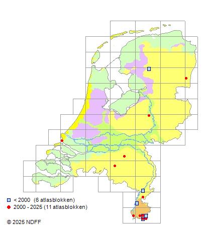 Zeer zeldzaam. Een soort die bekend is van enkele vindplaatsen in Limburg; daarbuiten wordt de soort incidenteel waargenomen. RL: ernstig bedreigd.