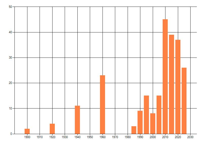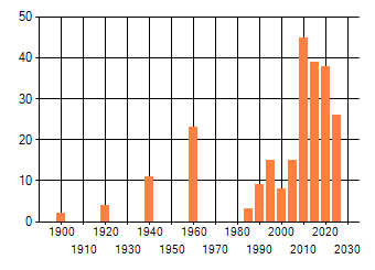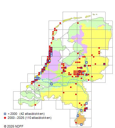 Het aantal atlasblokken (5x5 km) waarin de soort is gemeld binnen een periode van vijf jaar (vanaf 1980) of twintig jaar. Niet gecorrigeerd voor waarnemersinspanning en het aantal doorgegeven waarnemingen kan sterk variëren per periode, dus een trend in verspreiding kan hier niet direct uit worden afgelezen. Het opgegeven jaartal is het eerste jaar van de periode. Bron: gevalideerde waarnemingen uit de NDFF.