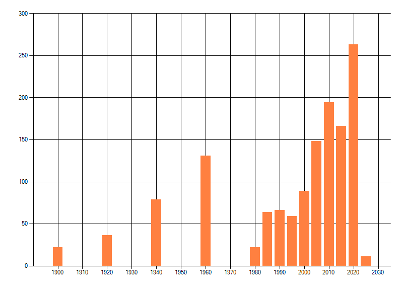 Het aantal atlasblokken (5x5 km) waarin de soort is gemeld binnen een periode van vijf jaar (vanaf 1980) of twintig jaar. Niet gecorrigeerd voor waarnemersinspanning en het aantal doorgegeven waarnemingen kan sterk variëren per periode, dus een trend in verspreiding kan hier niet direct uit worden afgelezen. Het opgegeven jaartal is het eerste jaar van de periode. Bron: gevalideerde waarnemingen uit de NDFF.