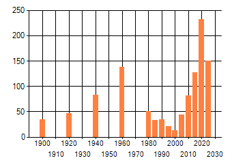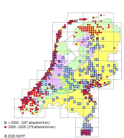 Het aantal atlasblokken (5x5 km) waarin de soort is gemeld binnen een periode van vijf jaar (vanaf 1980) of twintig jaar. Niet gecorrigeerd voor waarnemersinspanning en het aantal doorgegeven waarnemingen kan sterk variëren per periode, dus een trend in verspreiding kan hier niet direct uit worden afgelezen. Het opgegeven jaartal is het eerste jaar van de periode. Bron: gevalideerde waarnemingen uit de NDFF.