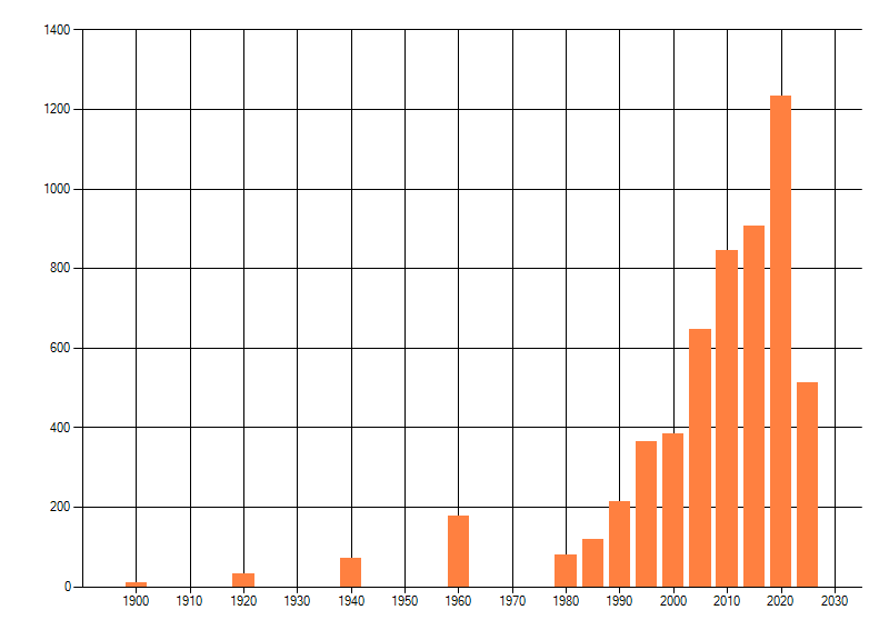 Het aantal atlasblokken (5x5 km) waarin de soort is gemeld binnen een periode van vijf jaar (vanaf 1980) of twintig jaar. Niet gecorrigeerd voor waarnemersinspanning en het aantal doorgegeven waarnemingen kan sterk variëren per periode, dus een trend in verspreiding kan hier niet direct uit worden afgelezen. Het opgegeven jaartal is het eerste jaar van de periode. Bron: gevalideerde waarnemingen uit de NDFF.