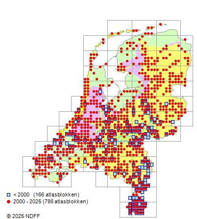 Het aantal atlasblokken (5x5 km) waarin de soort is gemeld binnen een periode van vijf jaar (vanaf 1980) of twintig jaar. Niet gecorrigeerd voor waarnemersinspanning en het aantal doorgegeven waarnemingen kan sterk variëren per periode, dus een trend in verspreiding kan hier niet direct uit worden afgelezen. Het opgegeven jaartal is het eerste jaar van de periode. Bron: gevalideerde waarnemingen uit de NDFF.