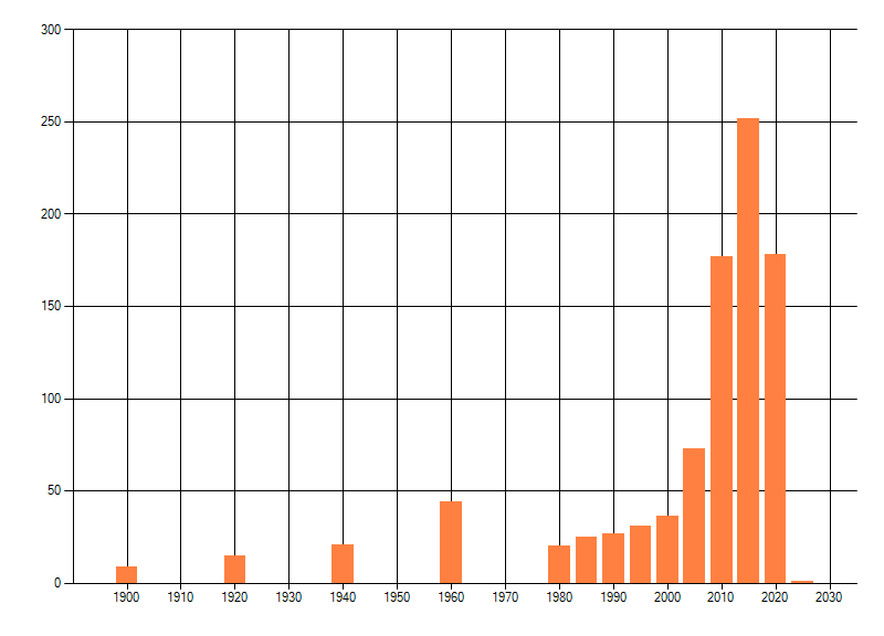 Het aantal atlasblokken (5x5 km) waarin de soort is gemeld binnen een periode van vijf jaar (vanaf 1980) of twintig jaar. Niet gecorrigeerd voor waarnemersinspanning en het aantal doorgegeven waarnemingen kan sterk variëren per periode, dus een trend in verspreiding kan hier niet direct uit worden afgelezen. Het opgegeven jaartal is het eerste jaar van de periode. Bron: gevalideerde waarnemingen uit de NDFF.