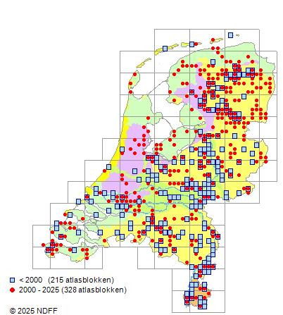 Het aantal atlasblokken (5x5 km) waarin de soort is gemeld binnen een periode van vijf jaar (vanaf 1980) of twintig jaar. Niet gecorrigeerd voor waarnemersinspanning en het aantal doorgegeven waarnemingen kan sterk variëren per periode, dus een trend in verspreiding kan hier niet direct uit worden afgelezen. Het opgegeven jaartal is het eerste jaar van de periode. Bron: gevalideerde waarnemingen uit de NDFF.
