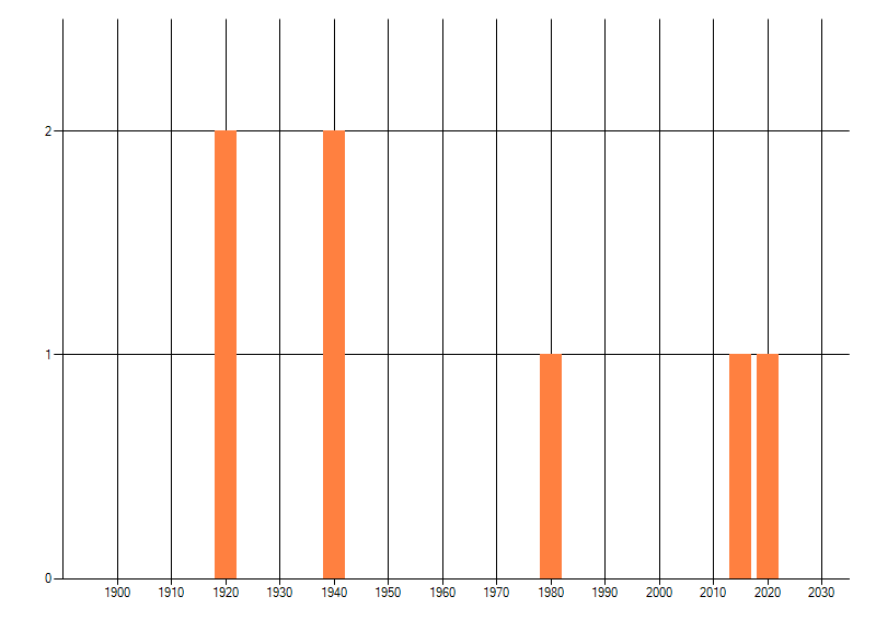 Het aantal atlasblokken (5x5 km) waarin de soort is gemeld binnen een periode van vijf jaar (vanaf 1980) of twintig jaar. Niet gecorrigeerd voor waarnemersinspanning en het aantal doorgegeven waarnemingen kan sterk variëren per periode, dus een trend in verspreiding kan hier niet direct uit worden afgelezen. Het opgegeven jaartal is het eerste jaar van de periode. Bron: gevalideerde waarnemingen uit de NDFF.