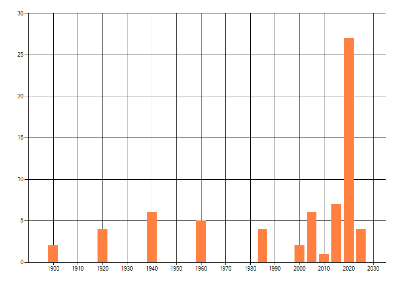 Het aantal atlasblokken (5x5 km) waarin de soort is gemeld binnen een periode van vijf jaar (vanaf 1980) of twintig jaar. Niet gecorrigeerd voor waarnemersinspanning en het aantal doorgegeven waarnemingen kan sterk variëren per periode, dus een trend in verspreiding kan hier niet direct uit worden afgelezen. Het opgegeven jaartal is het eerste jaar van de periode. Bron: gevalideerde waarnemingen uit de NDFF.