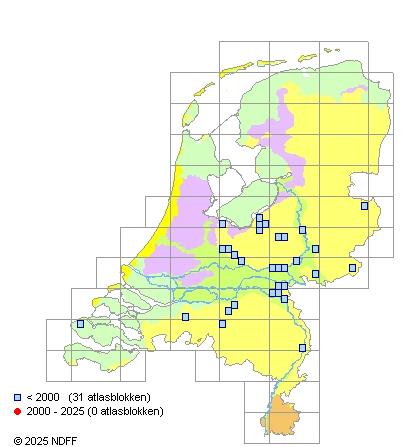 Het aantal atlasblokken (5x5 km) waarin de soort is gemeld binnen een periode van vijf jaar (vanaf 1980) of twintig jaar. Niet gecorrigeerd voor waarnemersinspanning en het aantal doorgegeven waarnemingen kan sterk variëren per periode, dus een trend in verspreiding kan hier niet direct uit worden afgelezen. Het opgegeven jaartal is het eerste jaar van de periode. Bron: gevalideerde waarnemingen uit de NDFF.