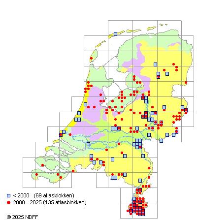 Het aantal atlasblokken (5x5 km) waarin de soort is gemeld binnen een periode van vijf jaar (vanaf 1980) of twintig jaar. Niet gecorrigeerd voor waarnemersinspanning en het aantal doorgegeven waarnemingen kan sterk variëren per periode, dus een trend in verspreiding kan hier niet direct uit worden afgelezen. Het opgegeven jaartal is het eerste jaar van de periode. Bron: gevalideerde waarnemingen uit de NDFF.