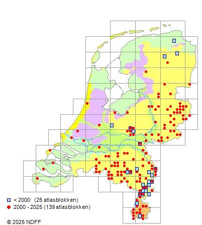 Het aantal atlasblokken (5x5 km) waarin de soort is gemeld binnen een periode van vijf jaar (vanaf 1980) of twintig jaar. Niet gecorrigeerd voor waarnemersinspanning en het aantal doorgegeven waarnemingen kan sterk variëren per periode, dus een trend in verspreiding kan hier niet direct uit worden afgelezen. Het opgegeven jaartal is het eerste jaar van de periode. Bron: gevalideerde waarnemingen uit de NDFF.