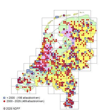 Het aantal atlasblokken (5x5 km) waarin de soort is gemeld binnen een periode van vijf jaar (vanaf 1980) of twintig jaar. Niet gecorrigeerd voor waarnemersinspanning en het aantal doorgegeven waarnemingen kan sterk variëren per periode, dus een trend in verspreiding kan hier niet direct uit worden afgelezen. Het opgegeven jaartal is het eerste jaar van de periode. Bron: gevalideerde waarnemingen uit de NDFF.