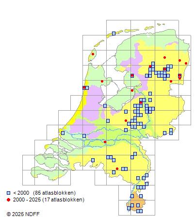 Het aantal atlasblokken (5x5 km) waarin de soort is gemeld binnen een periode van vijf jaar (vanaf 1980) of twintig jaar. Niet gecorrigeerd voor waarnemersinspanning en het aantal doorgegeven waarnemingen kan sterk variëren per periode, dus een trend in verspreiding kan hier niet direct uit worden afgelezen. Het opgegeven jaartal is het eerste jaar van de periode. Bron: gevalideerde waarnemingen uit de NDFF.