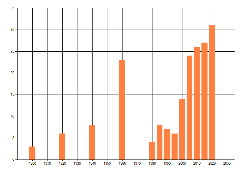 Het aantal atlasblokken (5x5 km) waarin de soort is gemeld binnen een periode van vijf jaar (vanaf 1980) of twintig jaar. Niet gecorrigeerd voor waarnemersinspanning en het aantal doorgegeven waarnemingen kan sterk variëren per periode, dus een trend in verspreiding kan hier niet direct uit worden afgelezen. Het opgegeven jaartal is het eerste jaar van de periode. Bron: gevalideerde waarnemingen uit de NDFF.