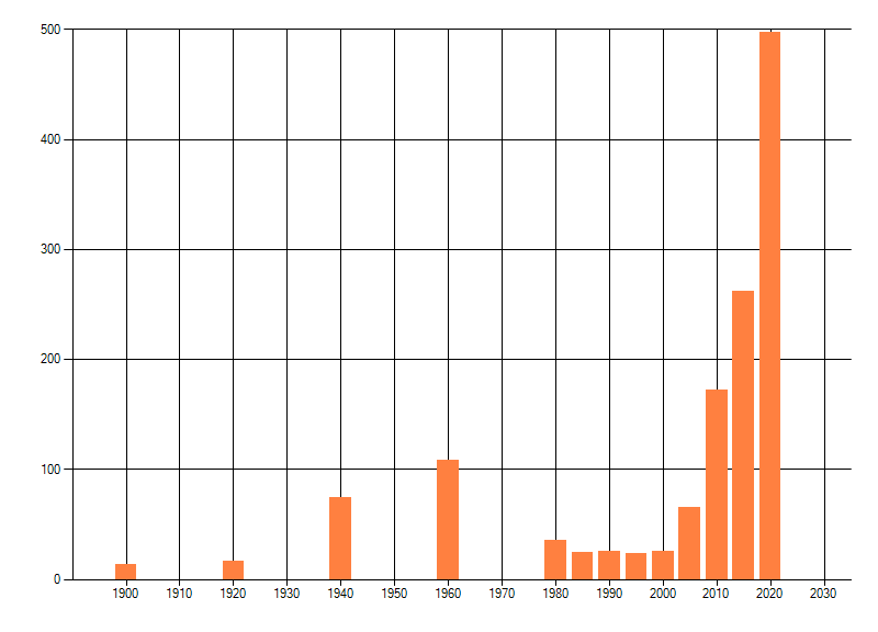 Het aantal atlasblokken (5x5 km) waarin de soort is gemeld binnen een periode van vijf jaar (vanaf 1980) of twintig jaar. Niet gecorrigeerd voor waarnemersinspanning en het aantal doorgegeven waarnemingen kan sterk variëren per periode, dus een trend in verspreiding kan hier niet direct uit worden afgelezen. Het opgegeven jaartal is het eerste jaar van de periode. Bron: gevalideerde waarnemingen uit de NDFF.