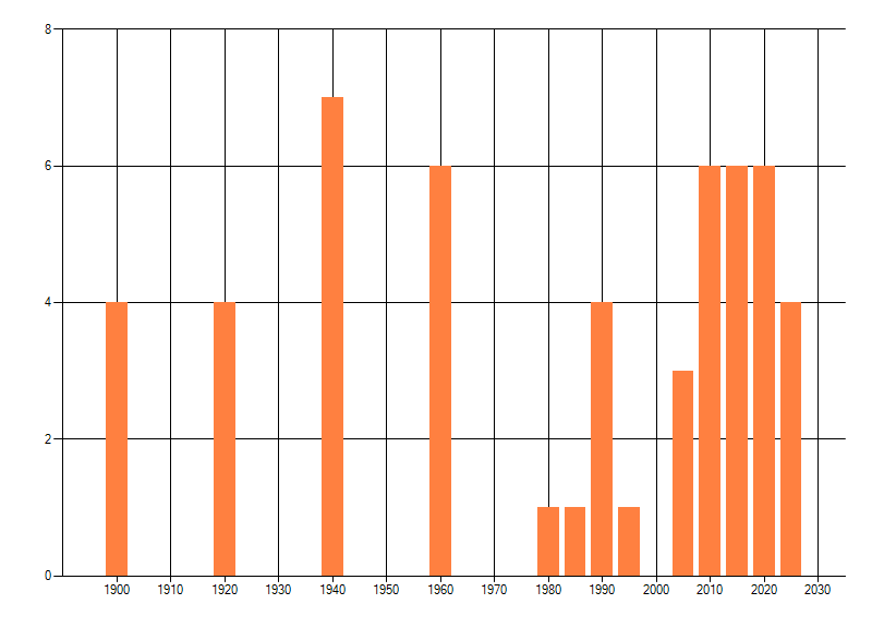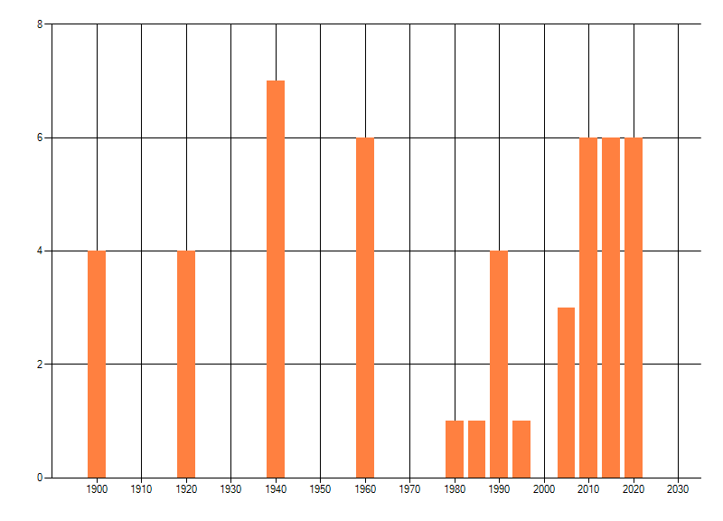 Het aantal atlasblokken (5x5 km) waarin de soort is gemeld binnen een periode van vijf jaar (vanaf 1980) of twintig jaar. Niet gecorrigeerd voor waarnemersinspanning en het aantal doorgegeven waarnemingen kan sterk variëren per periode, dus een trend in verspreiding kan hier niet direct uit worden afgelezen. Het opgegeven jaartal is het eerste jaar van de periode. Bron: gevalideerde waarnemingen uit de NDFF.