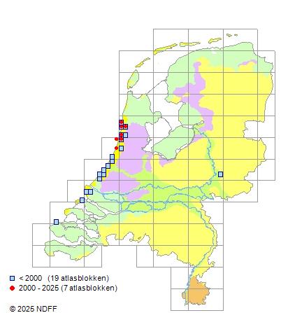 Zeldzaam. Een soort waarvan alleen recente waarnemingen bekend zijn uit de duinen bij IJmuiden en Egmond aan Zee. RL: gevoelig.