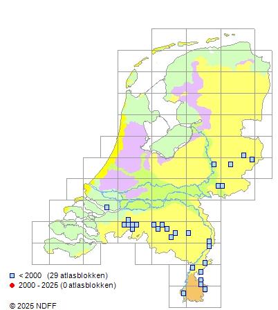 Het aantal atlasblokken (5x5 km) waarin de soort is gemeld binnen een periode van vijf jaar (vanaf 1980) of twintig jaar. Niet gecorrigeerd voor waarnemersinspanning en het aantal doorgegeven waarnemingen kan sterk variëren per periode, dus een trend in verspreiding kan hier niet direct uit worden afgelezen. Het opgegeven jaartal is het eerste jaar van de periode. Bron: gevalideerde waarnemingen uit de NDFF.