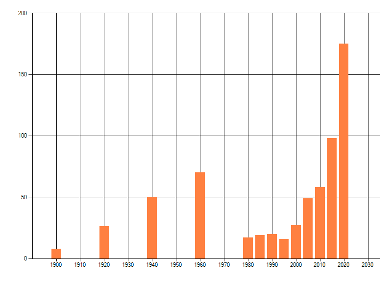 Het aantal atlasblokken (5x5 km) waarin de soort is gemeld binnen een periode van vijf jaar (vanaf 1980) of twintig jaar. Niet gecorrigeerd voor waarnemersinspanning en het aantal doorgegeven waarnemingen kan sterk variëren per periode, dus een trend in verspreiding kan hier niet direct uit worden afgelezen. Het opgegeven jaartal is het eerste jaar van de periode. Bron: gevalideerde waarnemingen uit de NDFF.
