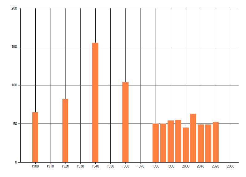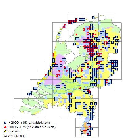 Het aantal atlasblokken (5x5 km) waarin de soort is gemeld binnen een periode van vijf jaar (vanaf 1980) of twintig jaar. Niet gecorrigeerd voor waarnemersinspanning en het aantal doorgegeven waarnemingen kan sterk variëren per periode, dus een trend in verspreiding kan hier niet direct uit worden afgelezen. Het opgegeven jaartal is het eerste jaar van de periode. Bron: gevalideerde waarnemingen uit de NDFF.