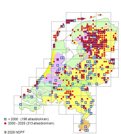 Het aantal atlasblokken (5x5 km) waarin de soort is gemeld binnen een periode van vijf jaar (vanaf 1980) of twintig jaar. Niet gecorrigeerd voor waarnemersinspanning en het aantal doorgegeven waarnemingen kan sterk variëren per periode, dus een trend in verspreiding kan hier niet direct uit worden afgelezen. Het opgegeven jaartal is het eerste jaar van de periode. Bron: gevalideerde waarnemingen uit de NDFF.