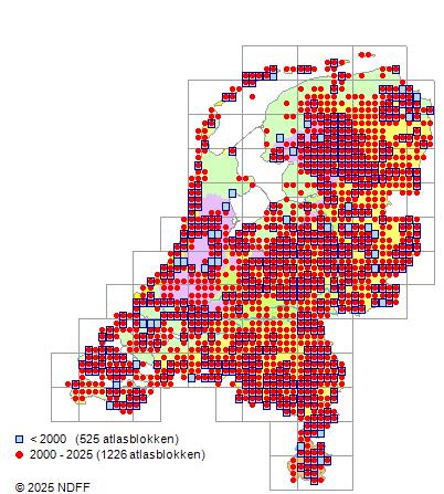 Het aantal atlasblokken (5x5 km) waarin de soort is gemeld binnen een periode van vijf jaar (vanaf 1980) of twintig jaar. Niet gecorrigeerd voor waarnemersinspanning en het aantal doorgegeven waarnemingen kan sterk variëren per periode, dus een trend in verspreiding kan hier niet direct uit worden afgelezen. Het opgegeven jaartal is het eerste jaar van de periode. Bron: gevalideerde waarnemingen uit de NDFF.