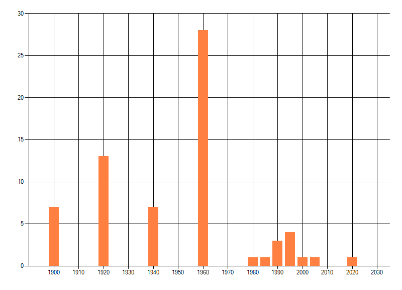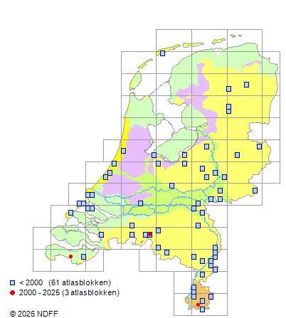 Het aantal atlasblokken (5x5 km) waarin de soort is gemeld binnen een periode van vijf jaar (vanaf 1980) of twintig jaar. Niet gecorrigeerd voor waarnemersinspanning en het aantal doorgegeven waarnemingen kan sterk variëren per periode, dus een trend in verspreiding kan hier niet direct uit worden afgelezen. Het opgegeven jaartal is het eerste jaar van de periode. Bron: gevalideerde waarnemingen uit de NDFF.