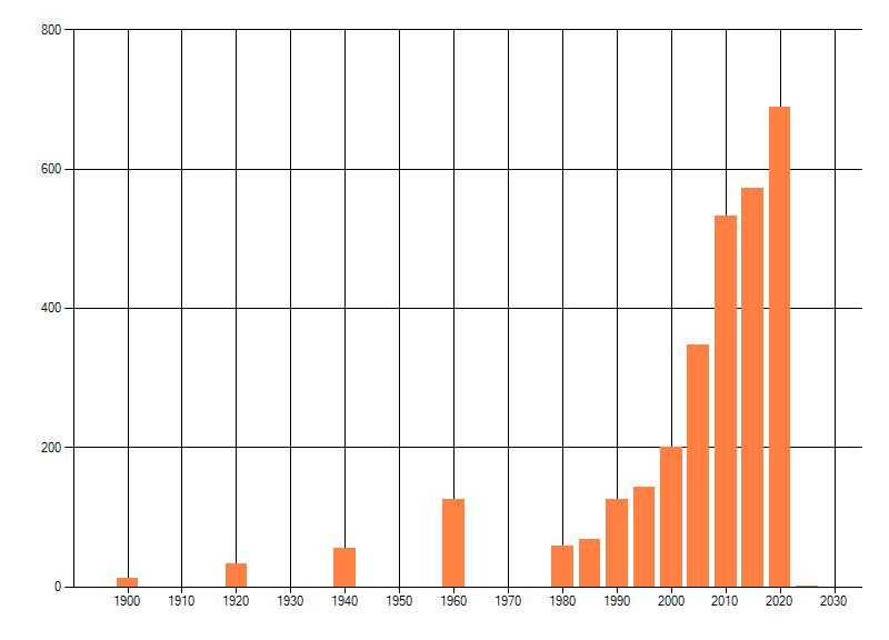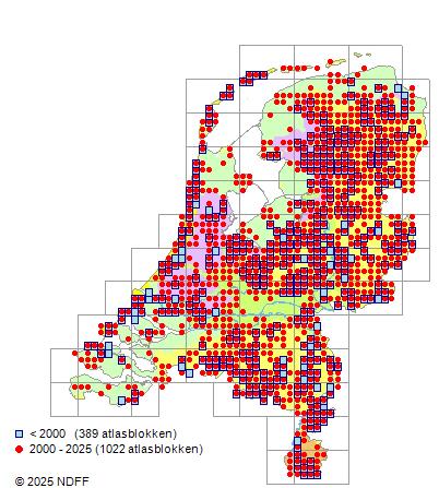 Het aantal atlasblokken (5x5 km) waarin de soort is gemeld binnen een periode van vijf jaar (vanaf 1980) of twintig jaar. Niet gecorrigeerd voor waarnemersinspanning en het aantal doorgegeven waarnemingen kan sterk variëren per periode, dus een trend in verspreiding kan hier niet direct uit worden afgelezen. Het opgegeven jaartal is het eerste jaar van de periode. Bron: gevalideerde waarnemingen uit de NDFF.