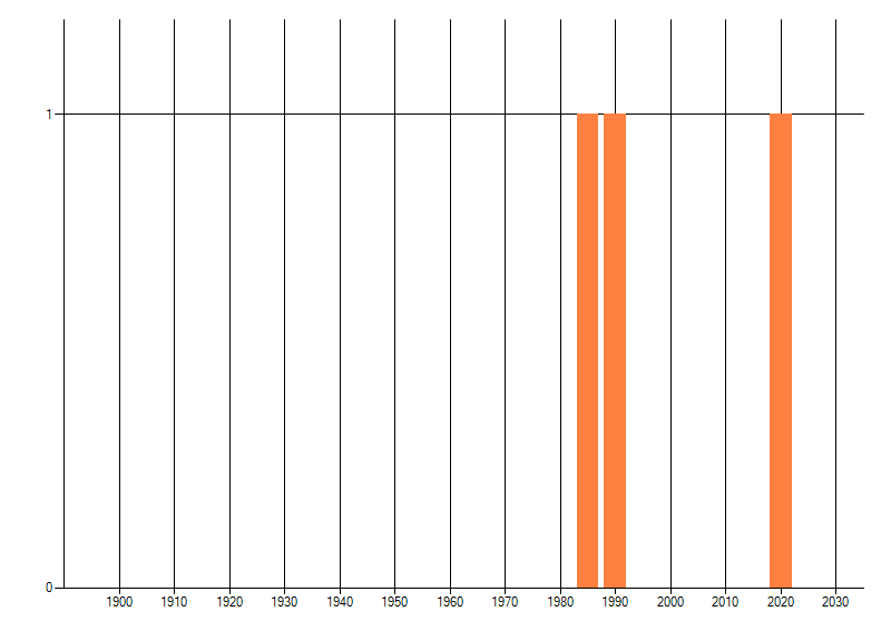 Het aantal atlasblokken (5x5 km) waarin de soort is gemeld binnen een periode van vijf jaar (vanaf 1980) of twintig jaar. Niet gecorrigeerd voor waarnemersinspanning en het aantal doorgegeven waarnemingen kan sterk variëren per periode, dus een trend in verspreiding kan hier niet direct uit worden afgelezen. Het opgegeven jaartal is het eerste jaar van de periode. Bron: gevalideerde waarnemingen uit de NDFF.