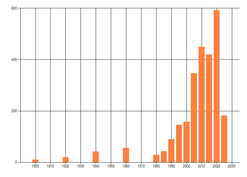 Het aantal atlasblokken (5x5 km) waarin de soort is gemeld binnen een periode van vijf jaar (vanaf 1980) of twintig jaar. Niet gecorrigeerd voor waarnemersinspanning en het aantal doorgegeven waarnemingen kan sterk variëren per periode, dus een trend in verspreiding kan hier niet direct uit worden afgelezen. Het opgegeven jaartal is het eerste jaar van de periode. Bron: gevalideerde waarnemingen uit de NDFF.
