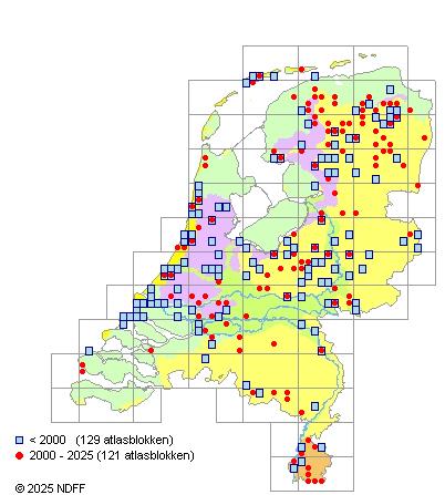 Het aantal atlasblokken (5x5 km) waarin de soort is gemeld binnen een periode van vijf jaar (vanaf 1980) of twintig jaar. Niet gecorrigeerd voor waarnemersinspanning en het aantal doorgegeven waarnemingen kan sterk variëren per periode, dus een trend in verspreiding kan hier niet direct uit worden afgelezen. Het opgegeven jaartal is het eerste jaar van de periode. Bron: gevalideerde waarnemingen uit de NDFF.